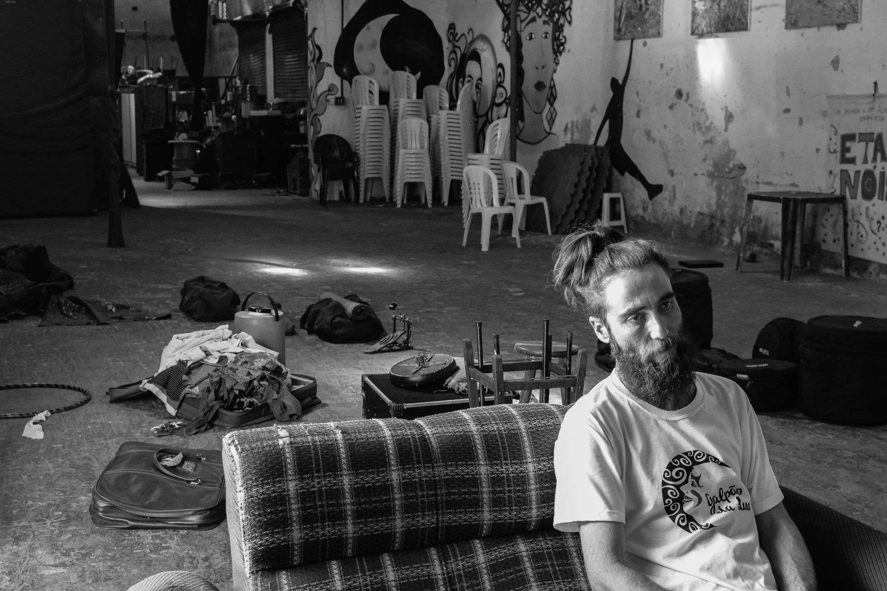 Felipe teve a coragem de tentar viver de arte numa terra de coronéis como Presidente Prudente continua a ser. Enfrentou muita resistência − inclusive familiar −, mas não esmoreceu: esforçou-se desde pequeno no estudo do contrabaixo, perseguiu o sonho de ser músico. Passou no Conservatório de Tatuí, uma das principais escolas de música do país. Contraiu tendinite e gastrite devido à intensa rotina de estudos movida a doses cavalares de café. Quando conheceu Lua, ele retornava de uma turnê de três meses em Portugal, França e na Espanha com a sua banda. “Eu tava vindo da Europa e voltei pra Prudente. Tava naquela ânsia de fazer alguma coisa e descobri esse grupo da FPTAI. Cheguei aqui cheio de planos e a banda tava sendo pouco”, ele me conta. “Descobri um povo que estava vivendo de arte, trabalhando com a periferia e fazendo arte para quem não tem acesso, não essa arte elitizada que tem por aí.”